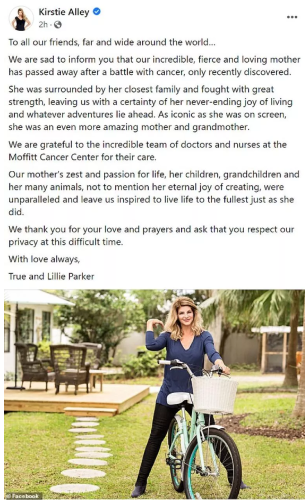 Cheers ve Look Who's Talking (Bak Şu Konuşana) gibi yapımlardaki rolleriyle tanınan Kirstie Alley’nin çocukları 30 yaşındaki True ve 28 yaşındaki Lily sabaha karşı sosyal medyada üzücü haberi doğrulayan bir açıklama yaptılar.
