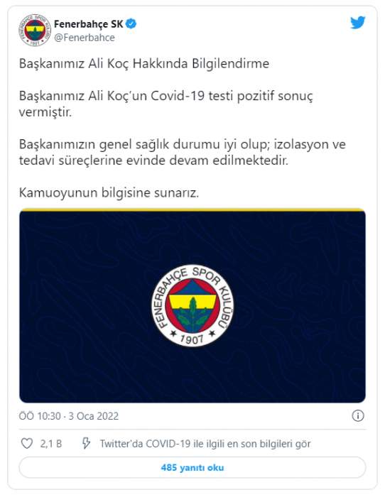 Başkanımız Ali Koç’un Covid-19 testi pozitif sonuç vermiştir. Başkanımızın genel sağlık durumu iyi olup; izolasyon ve tedavi süreçlerine evinde devam edilmektedir. Kamuoyunun bilgisine sunarız."