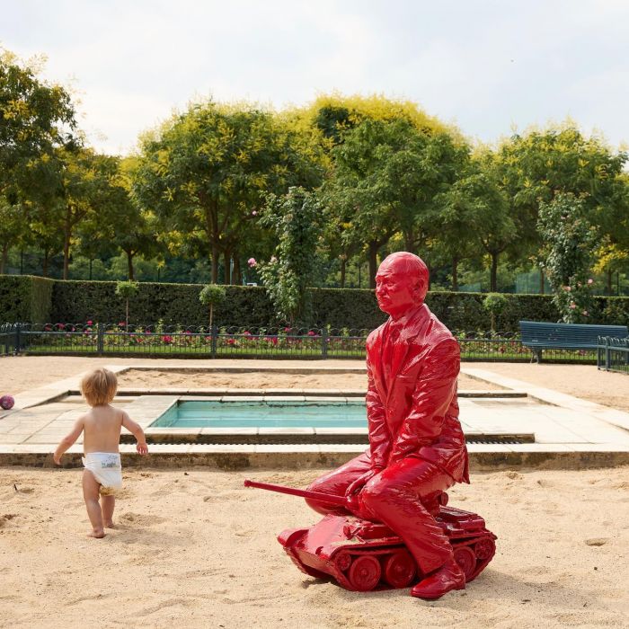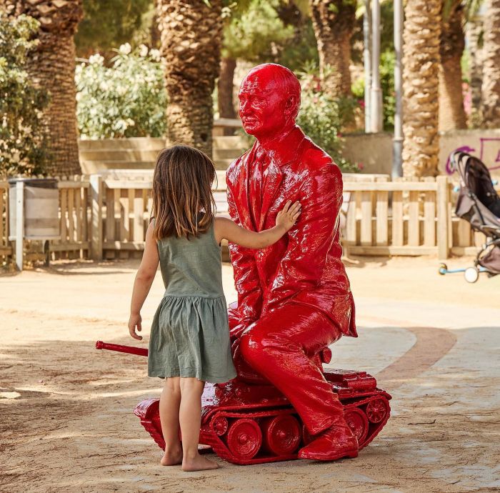 Küçük bir tankın üzerinde oturan Putin adeta çevresindeki çocukların yaşında görünüyordu. Heykelleriyle verdiği tepkili sosyal ve politik mesajlarıyla bilinen Fransız sanatçı James Colomina, her zaman yaptığı gibi heykelini izin almadan ama büyük tepki alarak yerleştirdi.