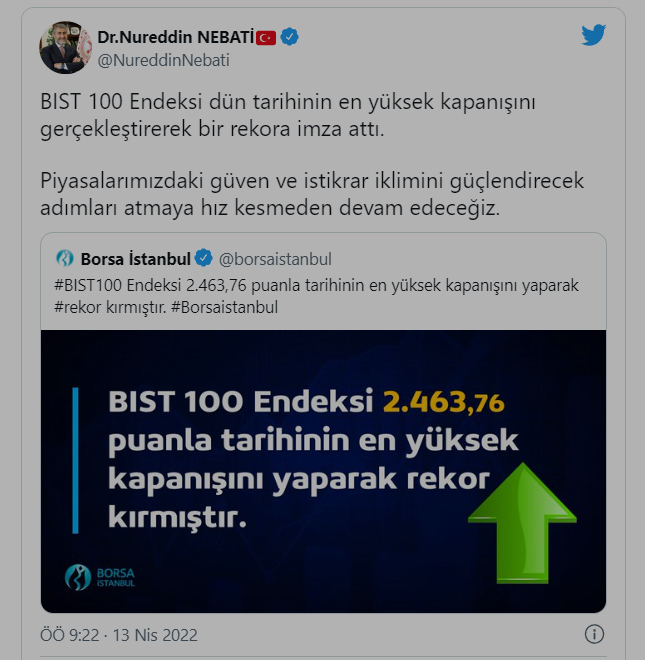 Bakan Nebati, "BIST 100 Endeksi dün tarihinin en yüksek kapanışını gerçekleştirerek bir rekora imza attı. Piyasalarımızdaki güven ve istikrar iklimini güçlendirecek adımları atmaya hız kesmeden devam edeceğiz" açıklamasını yaptı.