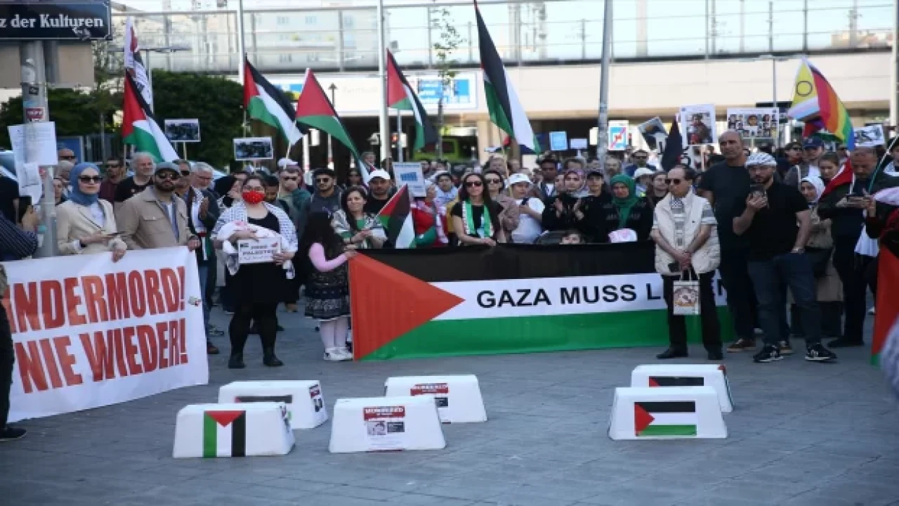 Viyana'nın 10'uncu bölgesindeki Kültürler Meydanı'nda toplanan göstericiler, Filistin bayraklarının yanı sıra "Soykırıma hayır", "Acil ateşkes", "Gazze’ye özgürlük" yazılı pankartlar açtı.