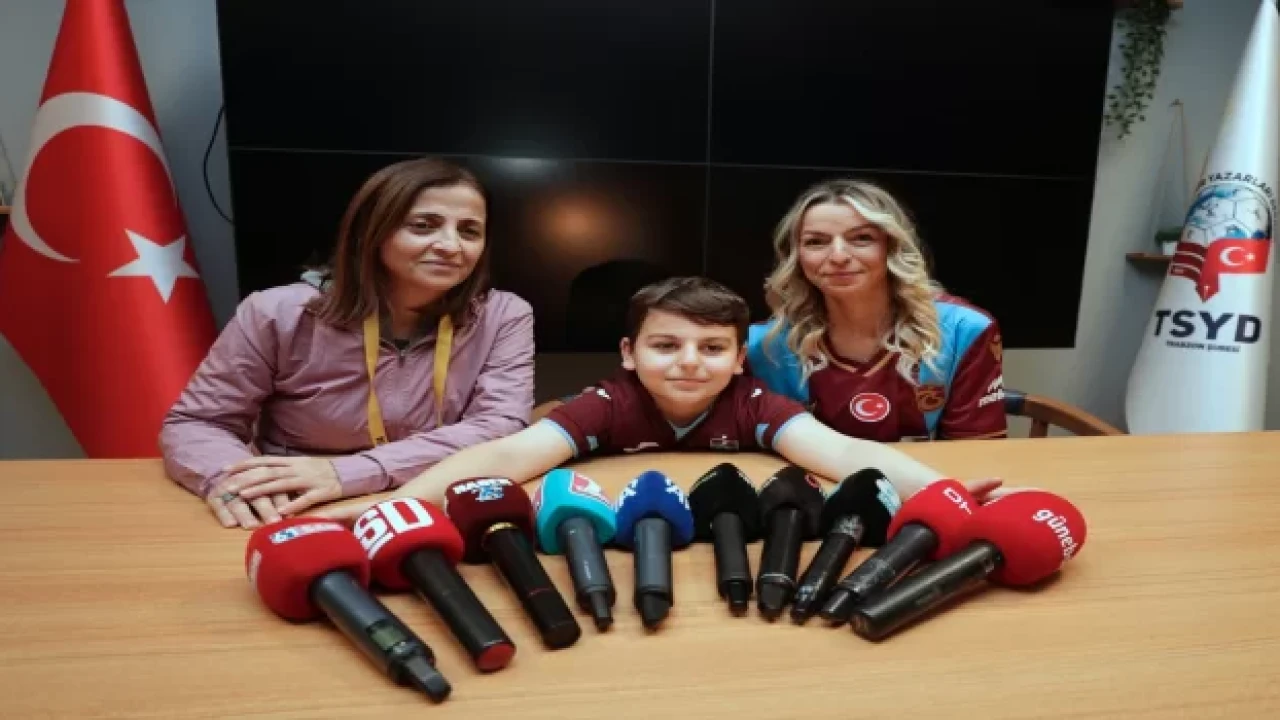 TRABZON (AA) Bursa'da üzerindeki Trabzonspor formasıyla kaldırımda otururken yanına yaklaşan bisikletlinin biber gazlı saldırısına uğrayan ilkokul öğrencisi Yusuf Emir Bolat, Türkiye Spor Yazarları Derneği (TSYD) Trabzon Şubesi'ni ziyaret etti.