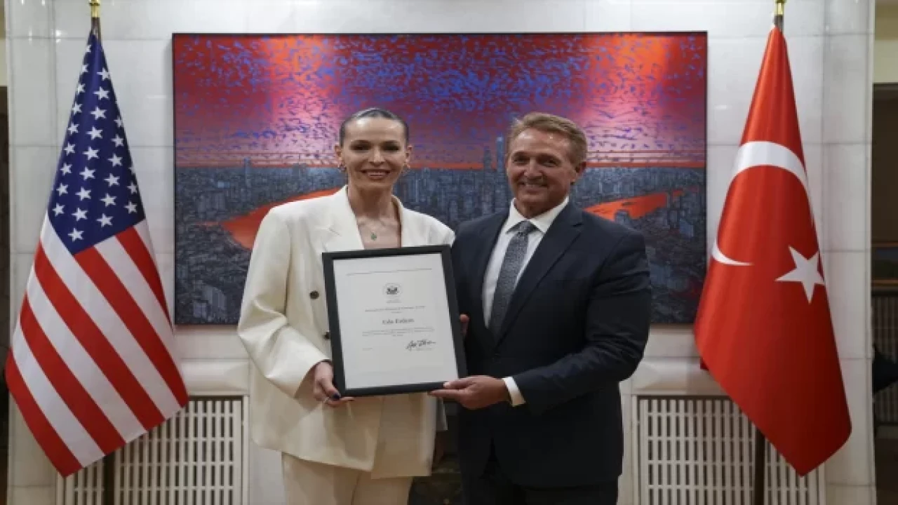 Eda Erdem Dündar'a ödüle aday gösterildiği için bir plaket takdim edilirken, Jeffry L. Flake, kadınların güçlendirilmesi konusunda Eda Erdem Dündar'ın çok önemli bir figür olduğunu söyledi.
