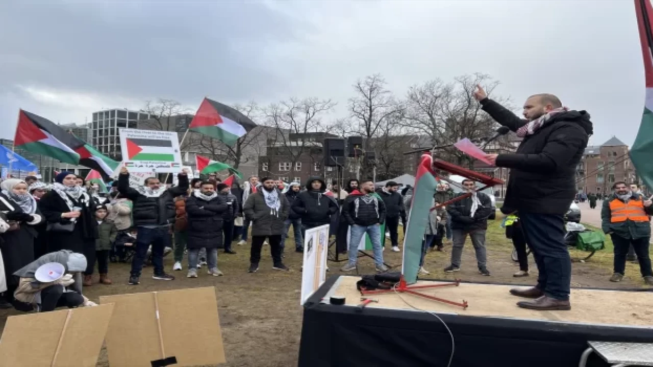Filistin bayraklarının da yer aldığı gösteride "Özgür Filistin", "Yazıklar olsun Rutte, ellerin kanlı" ve "İsrail bombalıyor, Hollanda ödüyor" sloganları atıldı.