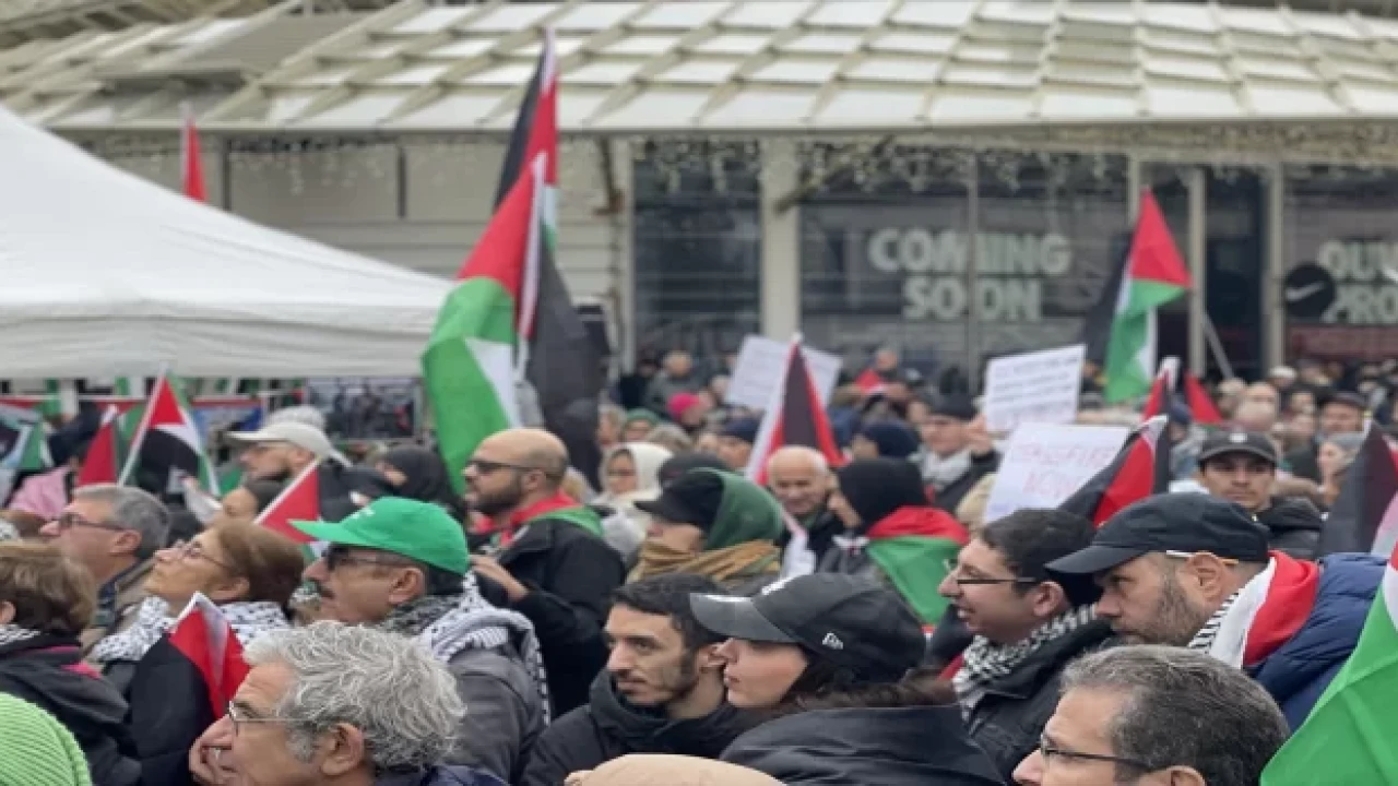 Filistin'e destek amacıyla toplanan göstericiler ellerinde Filistin bayraklarının yanı sıra "Mülteci Kamplarını Bombalamaktaki Amaç Ne? Soykırımı Durdurun" ve "Ürdün Nehri'nden Akdeniz'e, Filistin Özgür Olacak" yazılı dövizler taşıdı.