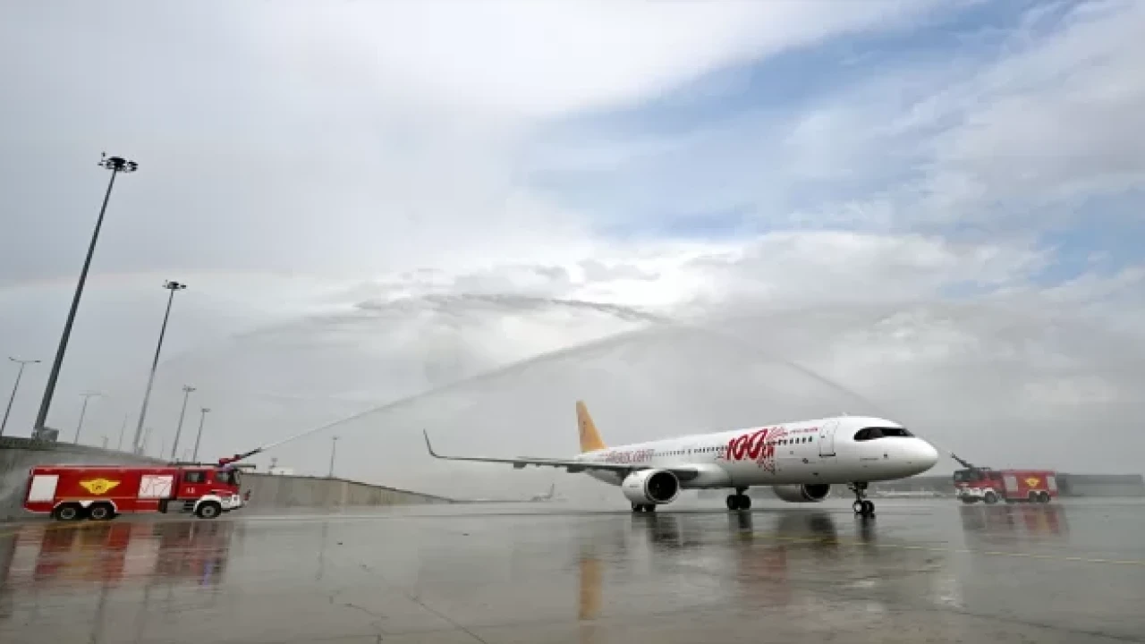 İSTANBUL (AA) Pegasus Hava Yollarının Cumhuriyet’in 100. yılında filosuna kattığı "Cumhuriyet" isimli 100. uçağı, İstanbul Sabiha Gökçen Havalimanı’na indi.