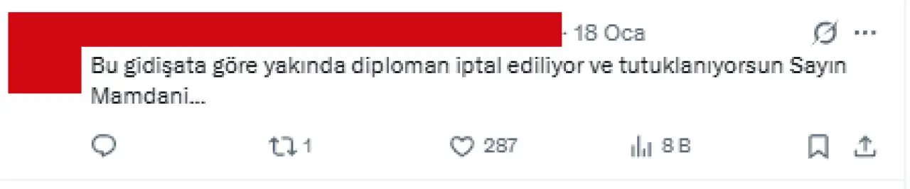 Bir başka kullanıcı ise Trump’ın olası tepkisine atıfta bulunarak, "Bu gidişata göre yakında diploman iptal ediliyor ve tutuklanıyorsun Sayın Mamdani..." uyarısında bulundu.
