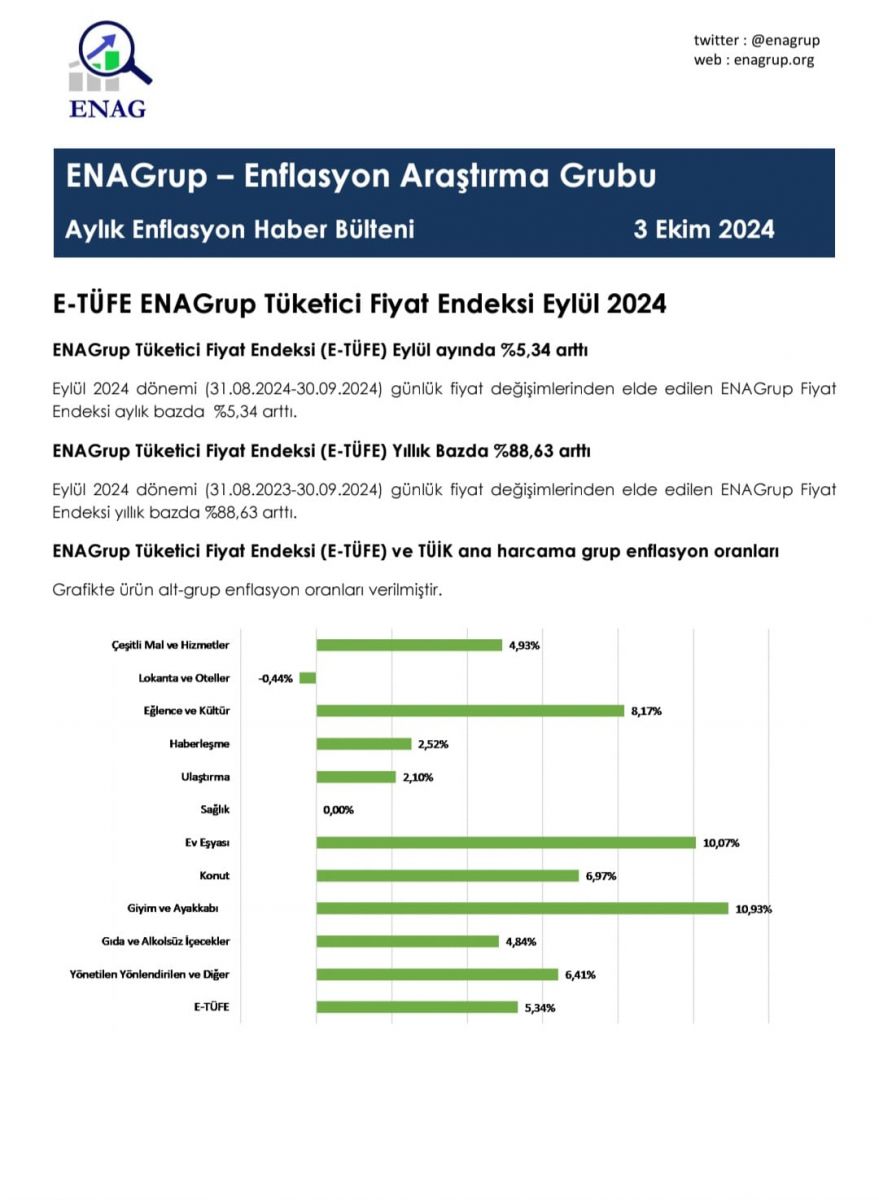 ENAG, E-TÜFE temmuz ayında yüzde 5,91, ağustos ayında da yüzde 3,47 oranında artmıştı. E-TÜFE’nin son 12 aylık artışı ise temmuzda yüzde 100,88, ağustosta da yüzde 90,35 olarak gerçekleşmişti.