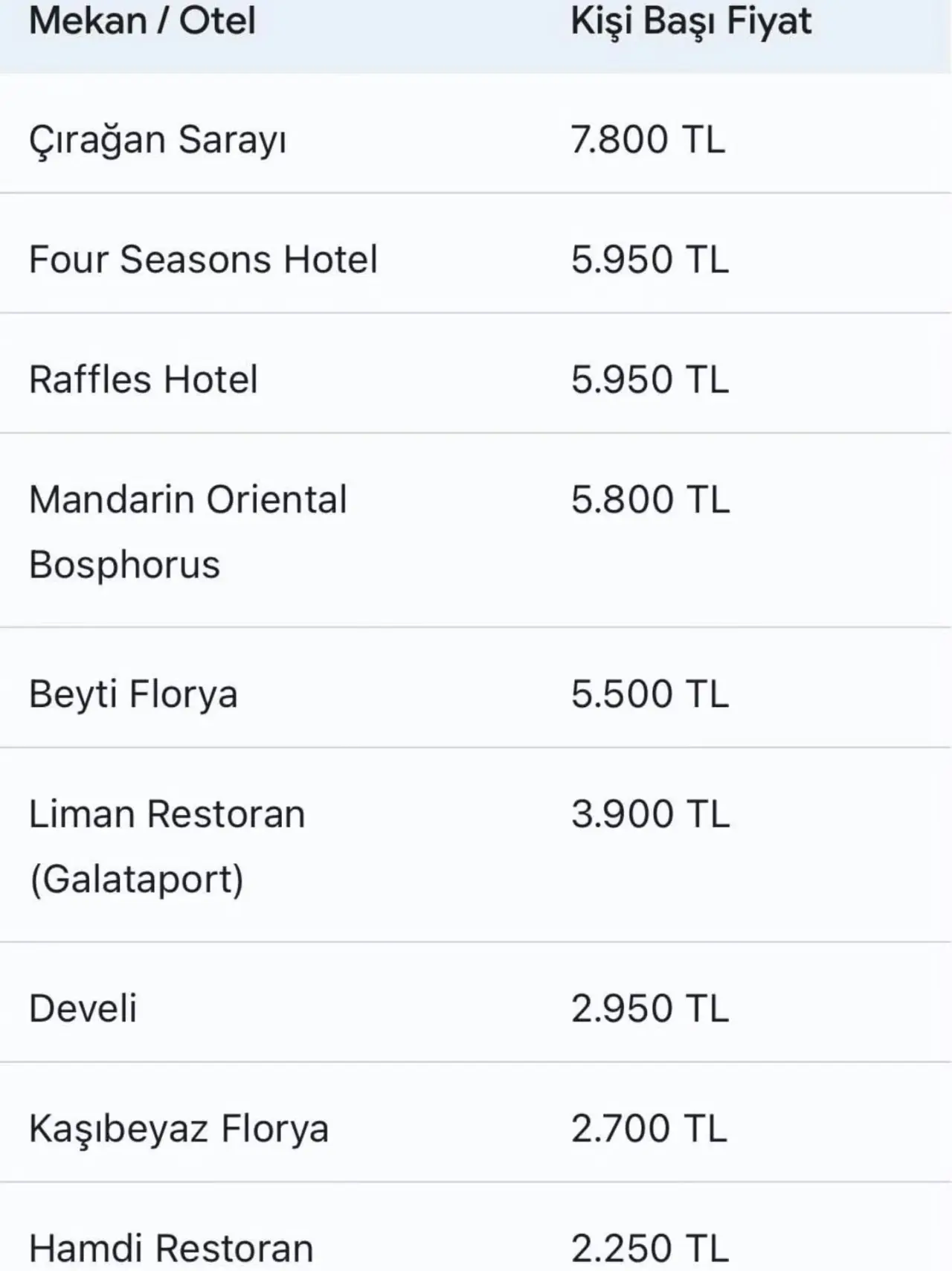 Kişi başı fiyatlar dikkat çekiyor