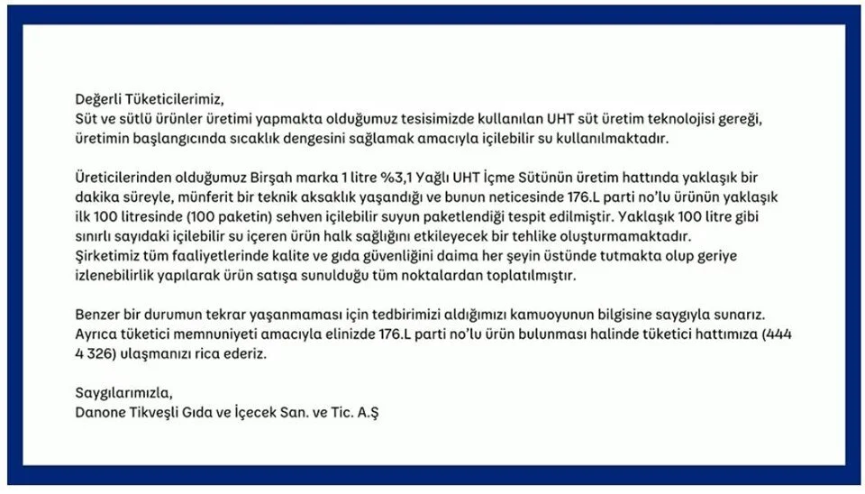 Danone, yaptığı açıklamada, yaşanan olayın üretim sürecindeki bir hata nedeniyle meydana geldiğini belirtti. Firma, ilgili hatalı ürünlerin güvenlik tedbirleri alınarak toplatılacağını ve tüketicilerin sağlığını riske atacak herhangi bir olumsuz durumun söz konusu olmadığı bilgisini paylaştı.