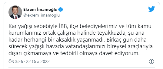 Kar yağışı sebebiyle İBB, ilçe belediyelerimiz ve tüm kamu kurumlarımız ortak çalışma halinde teyakkuzda, şu ana kadar herhangi bir aksaklık yaşanmadı. Birkaç gün daha sürecek yağışlı havada vatandaşlarımızı bireysel araçlarıyla dışarı çıkmamaya ve tedbirli olmaya davet ediyorum.