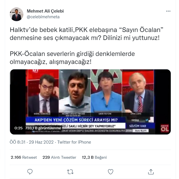 "Halktv'de bebek katili,PKK elebaşına "Sayın Öcalan" denmesine ses çıkmayacak mı? Dilinizi mi yuttunuz! PKK-Öcalan severlerin girdiği denklemlerde olmayacağız, alışmayacağız!" dedi.