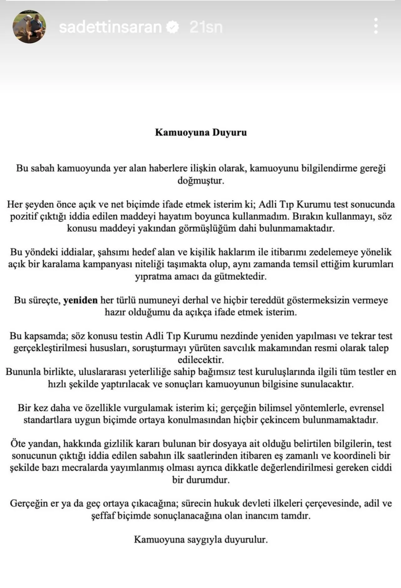 Her şeyden önce açık ve net biçimde ifade etmek isterim ki; Adli Tıp Kurumu test sonucunda pozitif çıktığı iddia edilen maddeyi hayatım boyunca kullanmadım. Bırakın kullanmayı, söz konusu maddeyi yakından görmüşlüğüm dahi bulunmamaktadır.