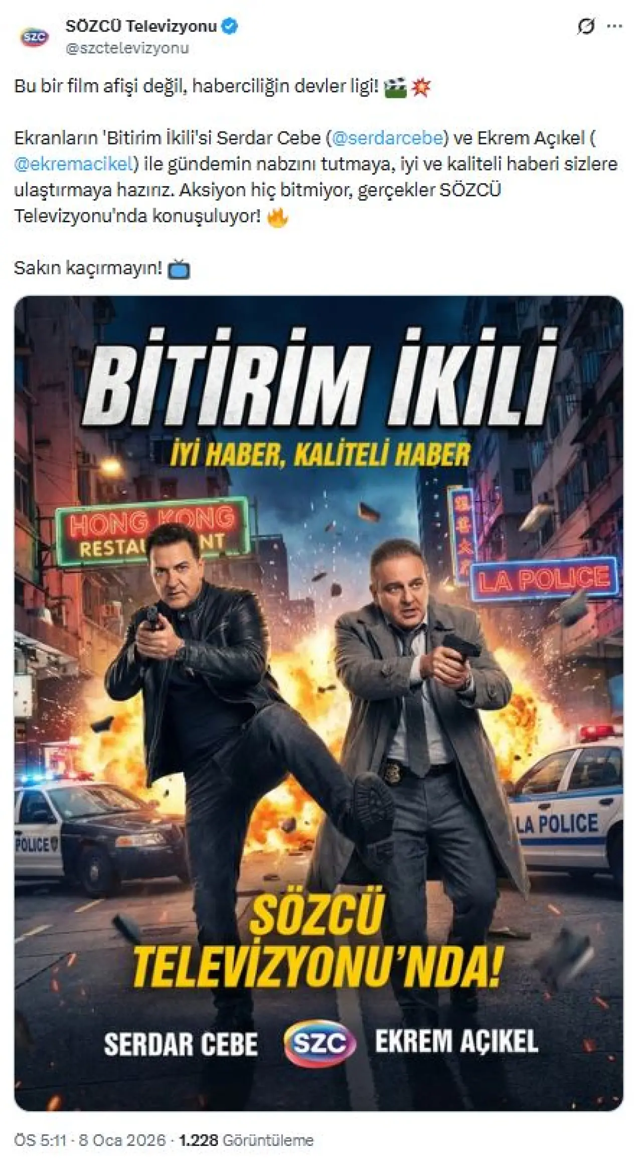 Sözcü TV, kült film 'Bitirim İkili'den esinlenerek yeni bir tanıtım afişi yaptı. "Bu bir film afişi değil, haberciliğin devler ligi!" notuyla paylaşılan görselde Serdar Cebe ve Ekrem Açıkel'i polis olarak yer aldı.