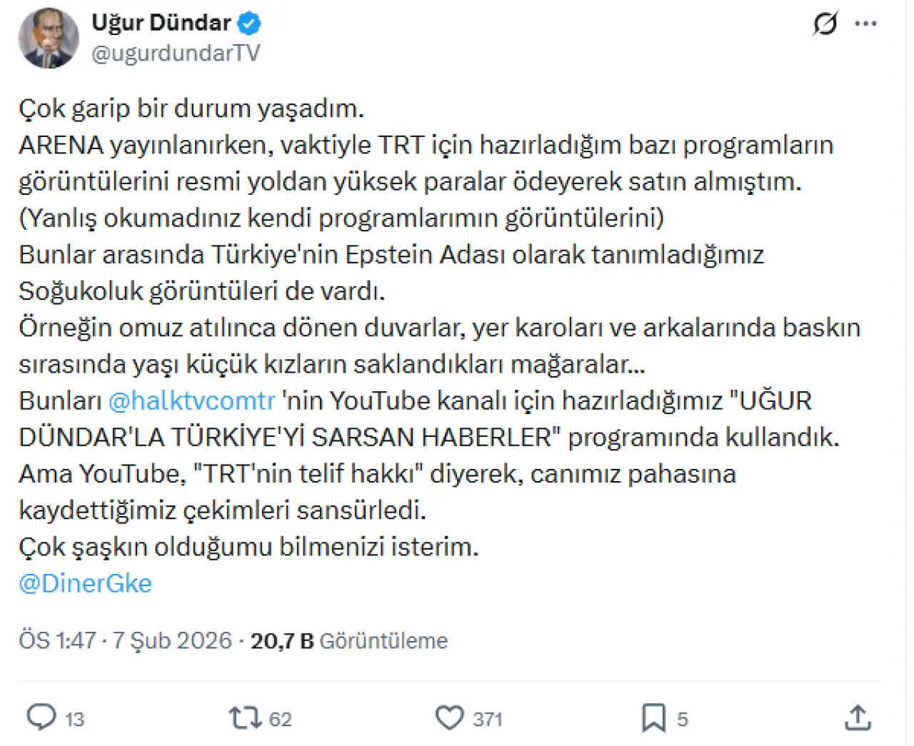 Söz konusu görüntülerin, Halk TV’nin YouTube kanalı için hazırlanan “Uğur Dündar’la Türkiye’yi Sarsan Haberler” programında kullanıldığını belirten Dündar, YouTube’un “TRT’nin telif hakkı” gerekçesiyle bu çekimleri sansürlediğini açıkladı.