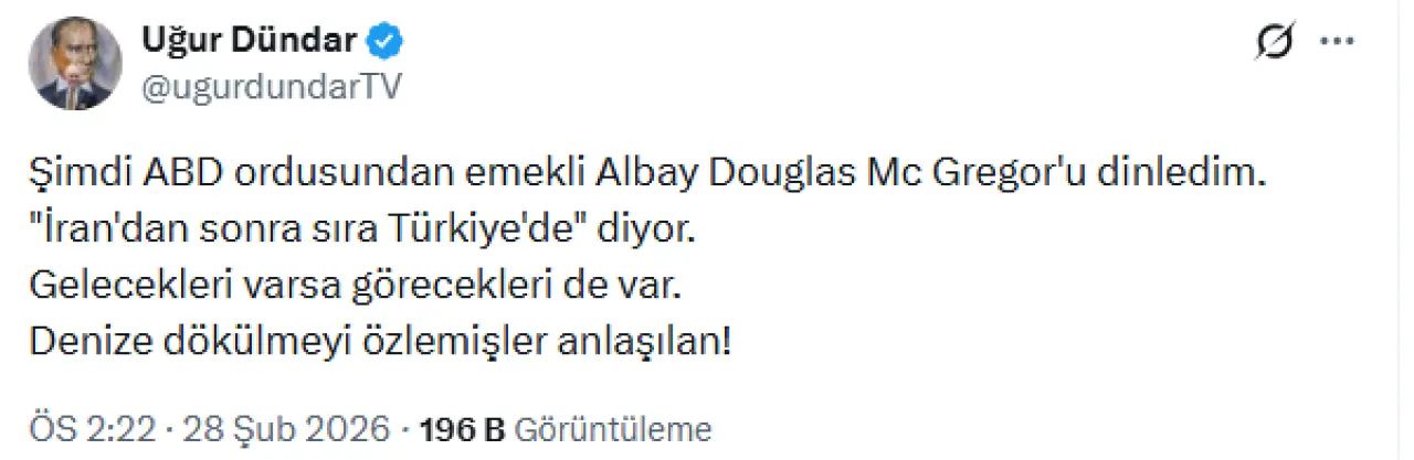 Dündar, Mc Gregor’un “İran’dan sonra sıra Türkiye’de” ifadelerini vurgulayarak, olası tehlikelere dikkat çekti. Uyarısında, “Gelecekleri varsa görecekleri de var. Denize dökülmeyi özlemişler anlaşılan!” yorumuyla paylaşıma dikkat çekici bir vurgu ekledi.