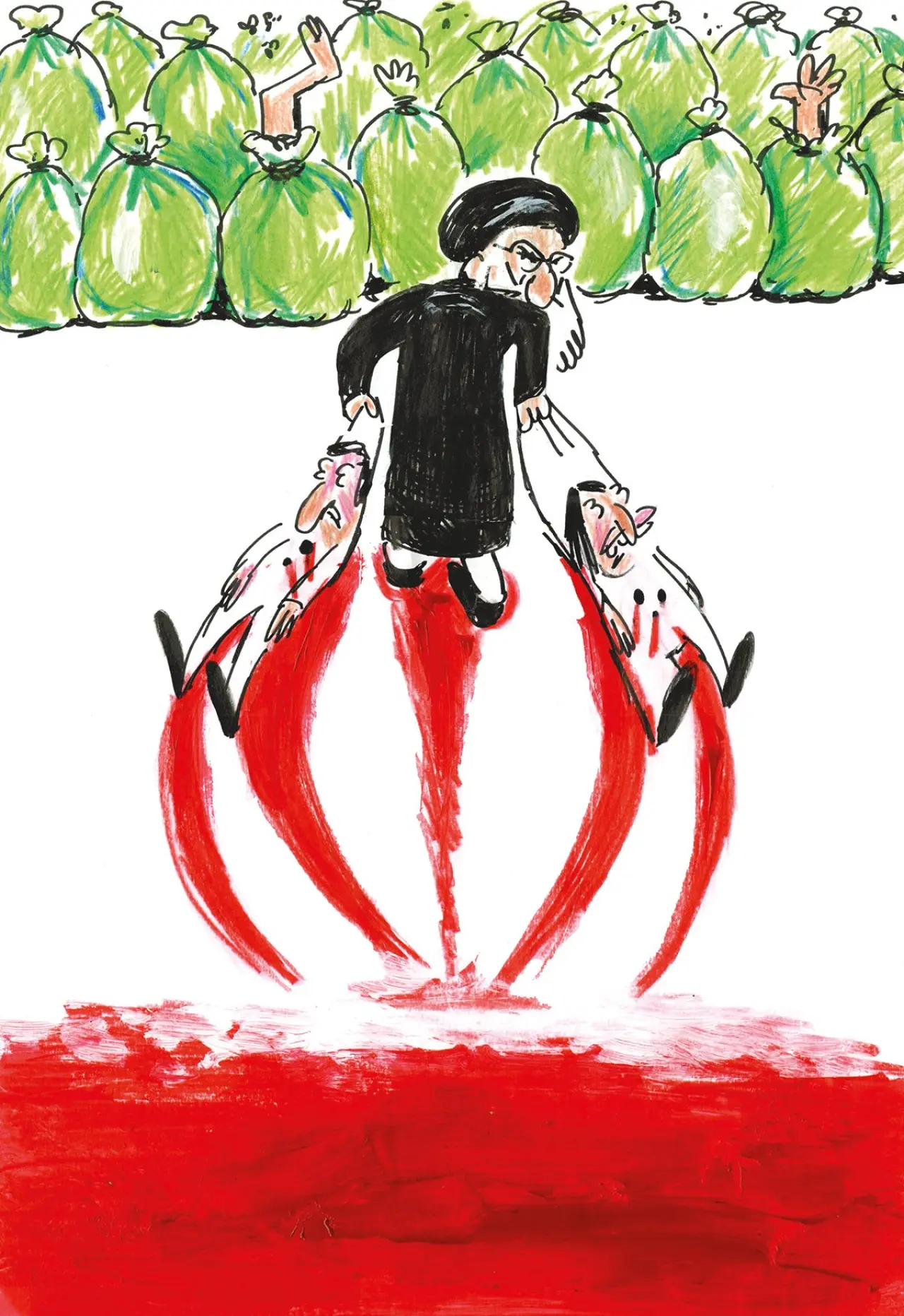 Derginin paylaştığı görselde, İran dini lideri Ayetullah Ali Hamaney'e benzeyen sarıklı ve cübbeli bir figürün, ellerinde iki kişiyi sürükleyerek yürüdüğü görülüyor. Figürün ayaklarının altından ve sürüklediği kişilerden akan kanlar zeminde büyük bir kan gölü oluştururken, arka planda üst üste yığılmış ve içlerinden insan uzuvlarının sarktığı yüzlerce yeşil torba dikkat çekiyor. Bu "yeşil torbalar", İran hapishanelerindeki doluluğu ve infaz edilen muhalifleri simgelerken, karikatürün genel tonu rejimin ayakta kalmak için şiddete başvurduğu mesajını taşıyor.