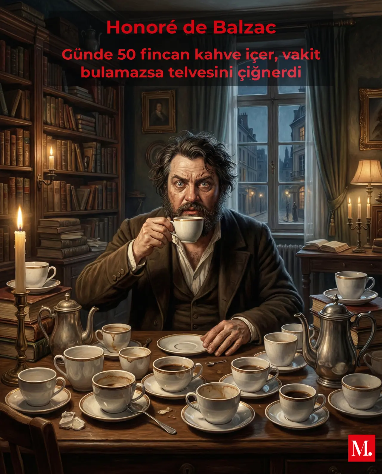 İnsanüstü bir çalışma temposuna sahip olan Balzac’ın yakıtı kahveydi. Günde 50 fincan koyu Türk kahvesi içtiği, vakit bulamadığında ise telveyi çiğnerek yediği bilinir. Bir oturuşta on kişilik yemek yiyebilen ve çatal kaşık kullanmayı pek sevmeyen yazarın sonunu getiren de muhtemelen bu aşırı kafein yüklemesi oldu.