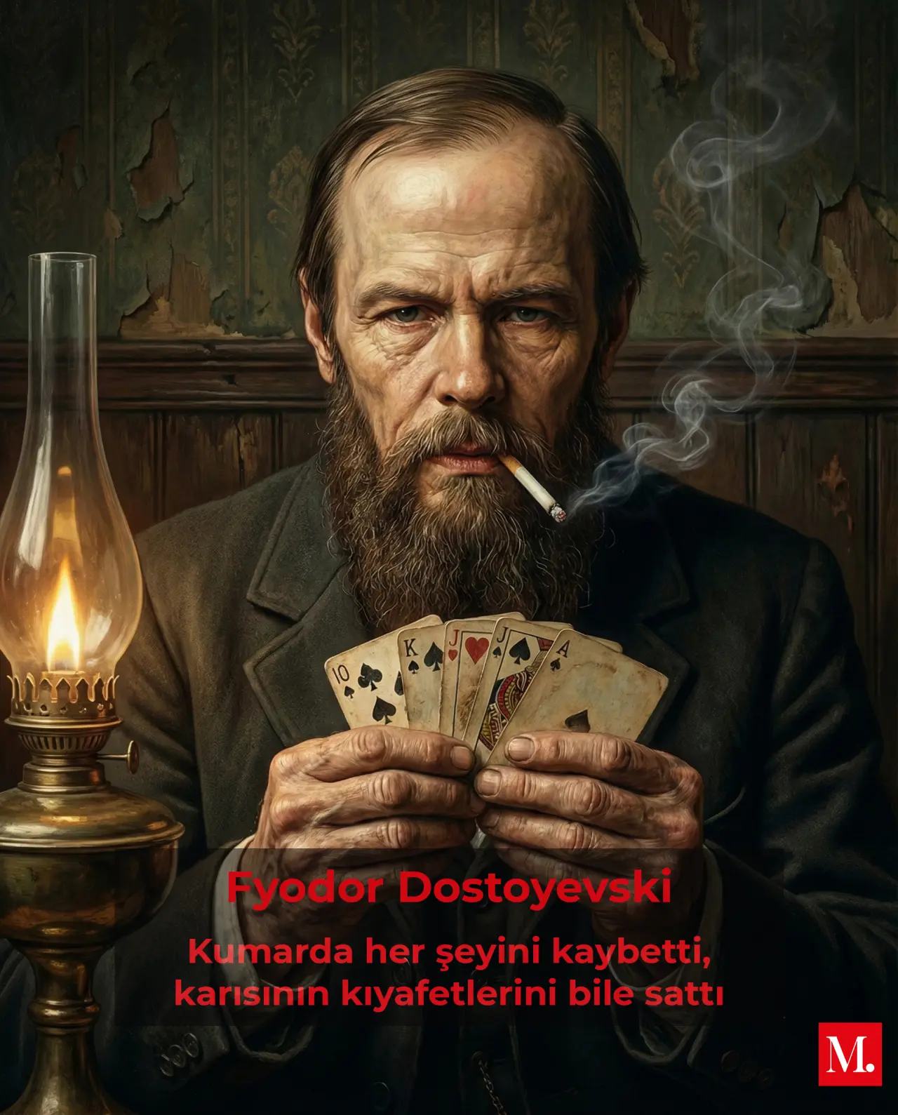 Gelmiş geçmiş en büyük romancılardan biri olan Dostoyevski, iflah olmaz bir kumarbazdı. Kumar masasında defalarca sıfırı tüketti; bu uğurda karısının parasını çaldı, evdeki eşyaları ve kıyafetleri rehinciye sattı. "Tanrı Ortodoks, İsa Rus'tur" diyecek kadar dindar ve milliyetçiydi. Ergen yaştaki kızlara ilgi duyduğunu saklamazdı.