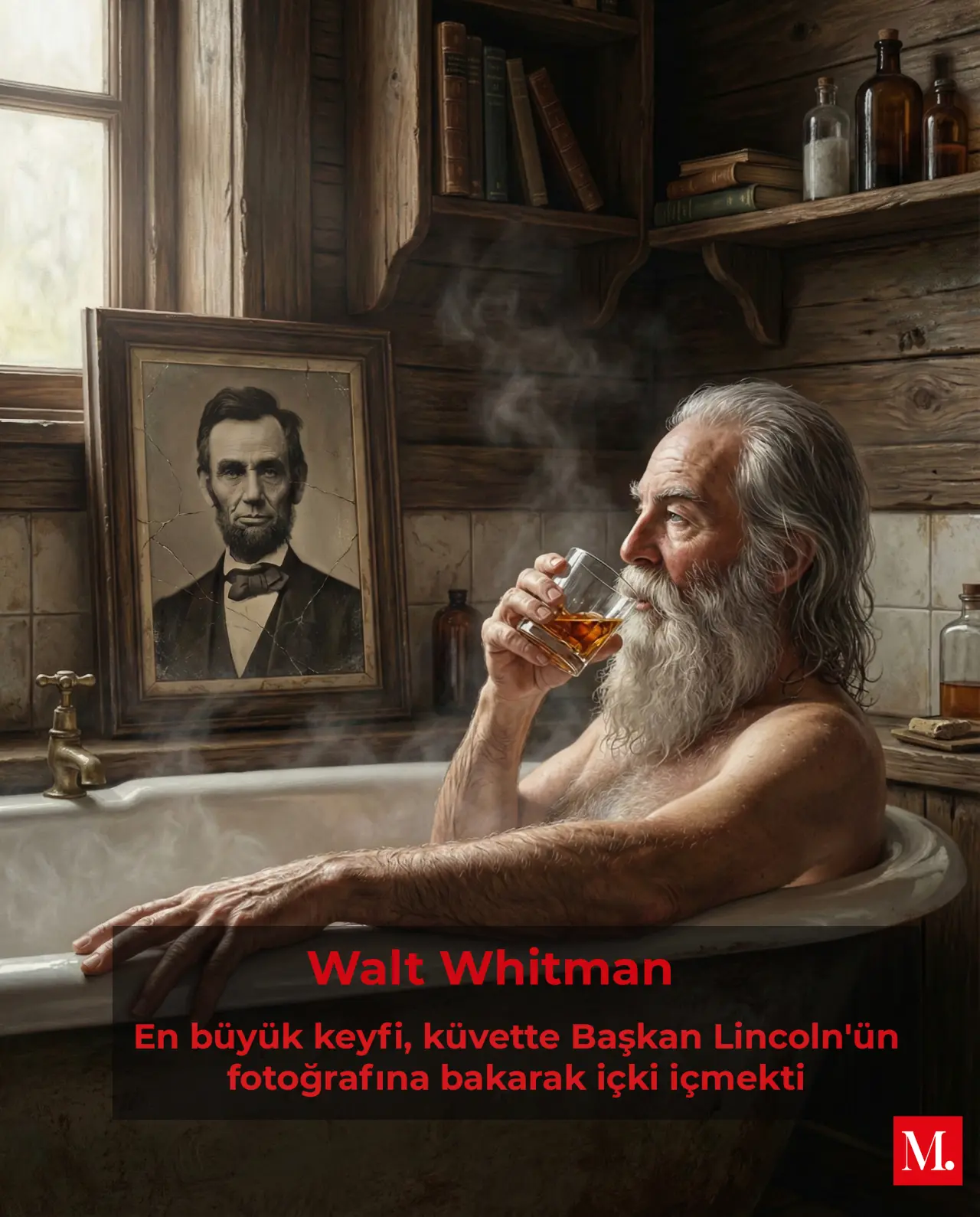 Amerikan şiirinin bu dev ismi, Başkan Abraham Lincoln’e saplantılı derecede aşıktı ve onun uğruna şiirler yazdı. En büyük keyfi, küvette uzanıp Lincoln’ün fotoğrafına bakarak içki içmek ve etrafa sular sıçratarak yüksek sesle marşlar söylemekti.