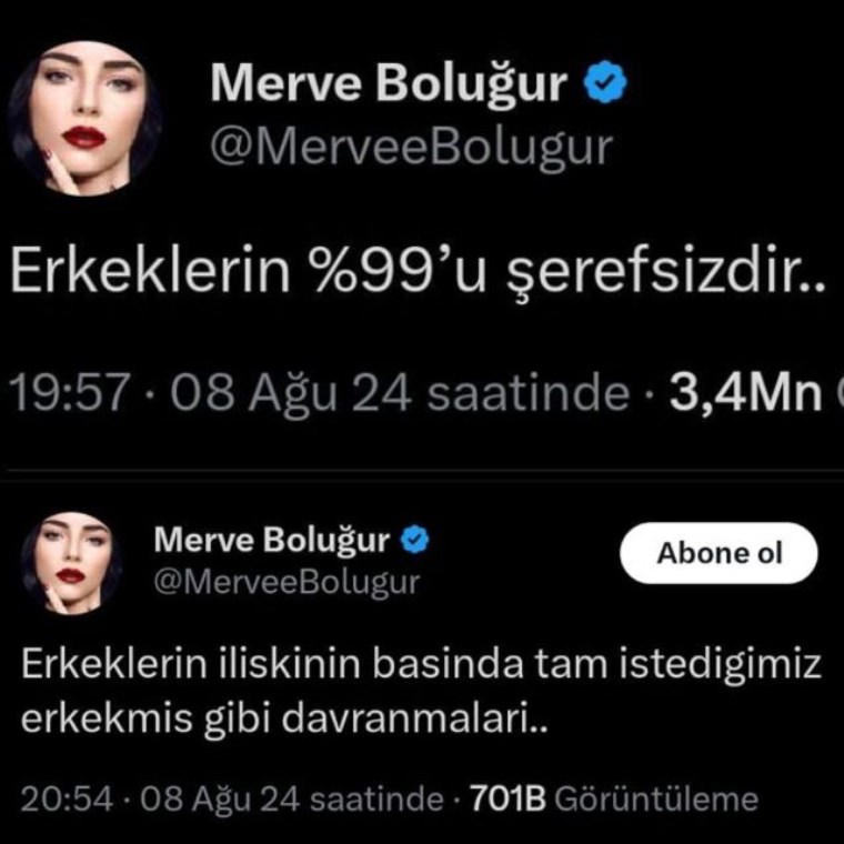 Merve Boluğur, sosyal medyada yaptığı paylaşımlarla gündem olmaya devam ediyor. 8 Ağustos'ta "Erkeklerin %99'u şerefsizdir" şeklindeki paylaşımı sosyal medyada çok konuşuldu. Boluğur, 10 Ağustos’ta ise erkekler aleyhine "Instagram açılsın, erkekler kapatılsın" cümlesiyle bir paylaşımda bulundu.
