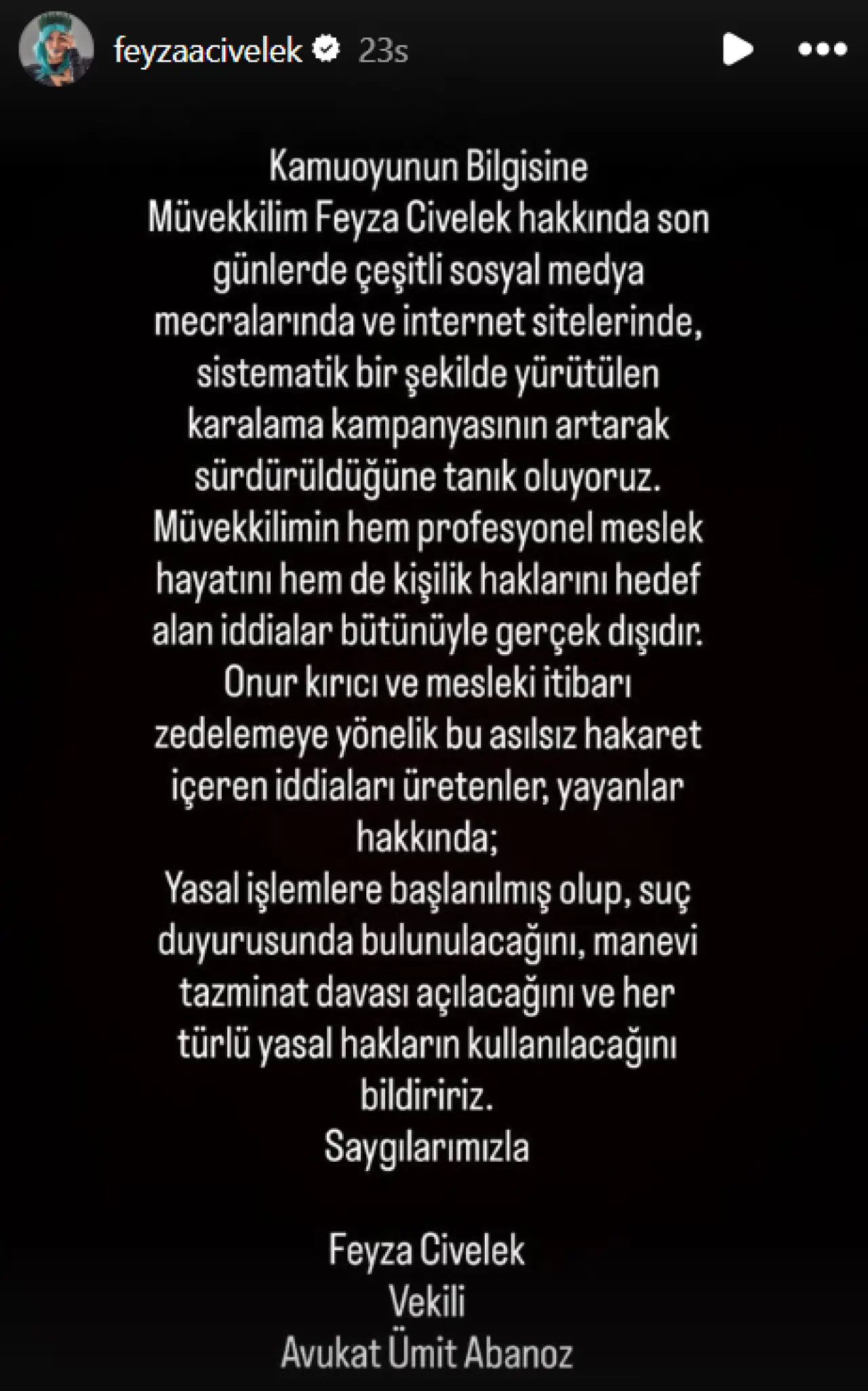 Civelek’in avukatları, dijital mecralarda yapılan paylaşımların hukuki sonuçları olacağına dikkat çekerek, benzer içeriklere karşı da yasal hakların kullanılacağını belirtti.