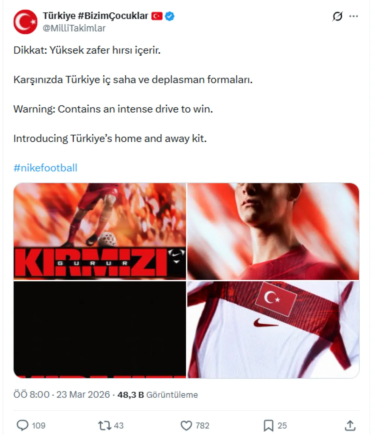 Türkiye Milli Takımlar resmi sosyal medya hesaplarından hem Türkçe hem de İngilizce olarak paylaşılan "Dikkat: Yüksek zafer hırsı içerir" (Warning: Contains an intense drive to win) uyarısı, yeni formaların taşıdığı iddialı ruhu gözler önüne serdi. Tanıtım görsellerinde özellikle genç yetenek Arda Güler'in kullanılması, milli takımın dinamizmini ve yeni jenerasyonun enerjisini sahaya yansıtma hedefini vurguluyor.