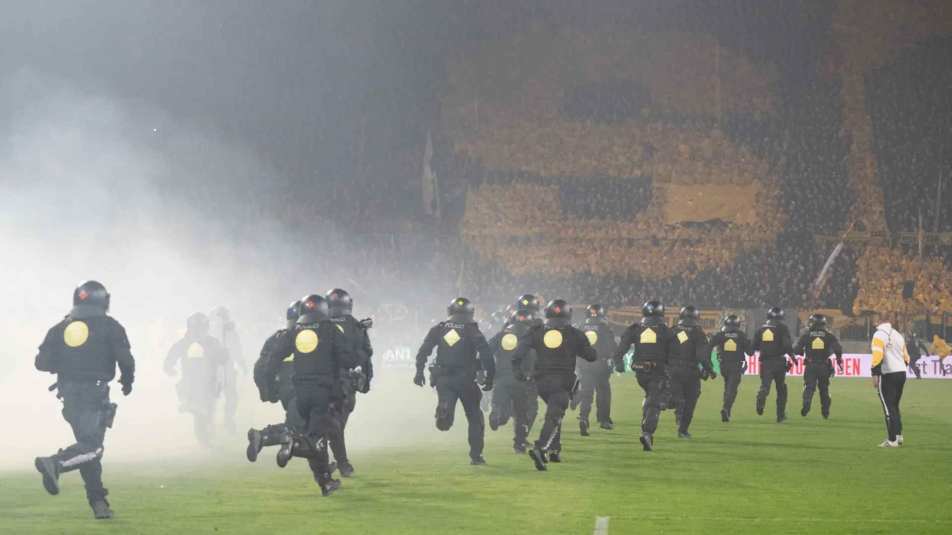 Hakem Sven Jablonski, sahada yaşanan kaos nedeniyle karşılaşmayı durdurdu. Oyuncular can güvenliği için hızla soyunma odasına çekilirken, Dresden taraftarları ele geçirdikleri Hertha bayrağını sahanın ortasında yaktı. Güvenlik güçlerinin sahadaki taraftarları tribüne geri püskürtmesinin ardından maç yaklaşık 20 dakikalık bir gecikmeyle yeniden başladı. Ancak bu süreçte Hertha ultraslarının büyük bir bölümü stadyumu terk etti; ikinci yarıda ise deplasman tribünü tamamen boşalmıştı.