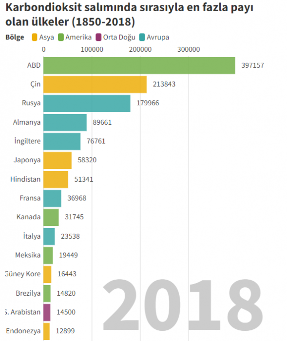 Yukarıdaki grafikte yer alan 13 ülke, 1850 yılından bu yana atmosfere yayılan karbondioksit salımında toplam korbondioksit oranının üçte ikisine sebep oldu.