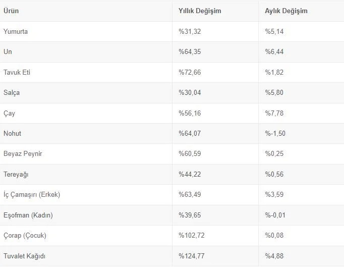 Temel tüketim maddelerinin bir önceki yılın ağustos ayına göre fiyat artışlarına bakıldığında en çarpıcı fiyat artışlarından birinin yüzde 124,77 artış oranı ile tuvalet kağıdı fiyatlarında yaşandığı görüldü.