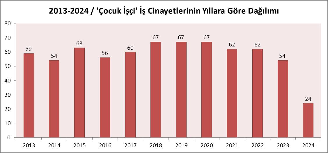 2013-2024 yıllarında Türkiye’nin 77 şehrinde çocuk iş cinayeti tespit edildi. Çocuk işçi cinayetlerinin şehirlere göre dağılımında ise; Şanlıurfa’da 52 çocuk işçinin çoğu tarım iş kolunda, Gaziantep’te 40 çocuk işçi tarımda, sanayide ve özellikle tekstilde, İstanbul’da 40 çocuk işçi metal başta olmak üzere sanayide, inşaatta, motokurye ve sokakta, Adana’da 36 çocuk işçi ise tarım, sanayi, inşaat iş kolunda hayatını kaybetti.