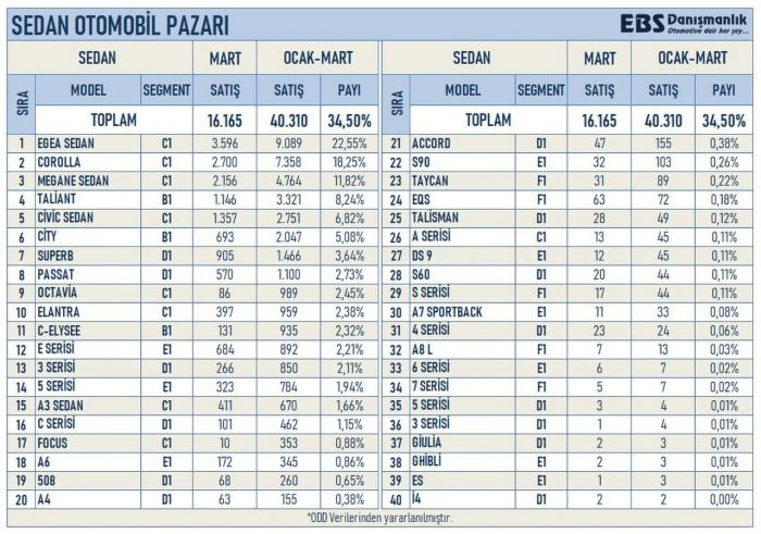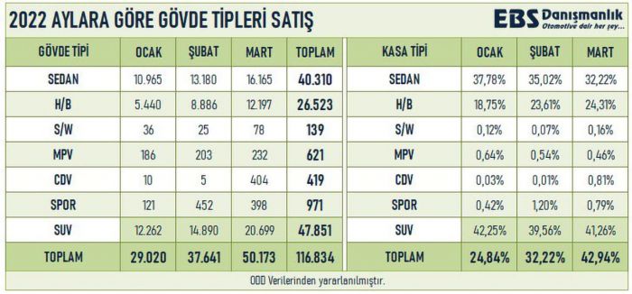 Paylaşılan tabloya göre yakın zamana kadar sedanların baskın olduğu Türkiye’de tercih tamamen SUV’a dönüştü. 2022 yılının ilk 3 ayında satılan 116 bin 834 otomobilin 47.851’i SUV tipiydi. Sedanların sayısıysa 40.310 ile sınırlı kaldı. Paylaşılan bir diğer tabloysa Türkiye’deki sedan sayısını ayakta tutan araçları gözler önüne serdi.