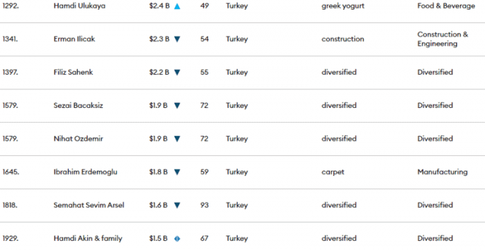 Hamdi Ulukaya dışındaki milyarderlerin servetlerinde geçen seneye göre düşüş olduğu görüldü.
