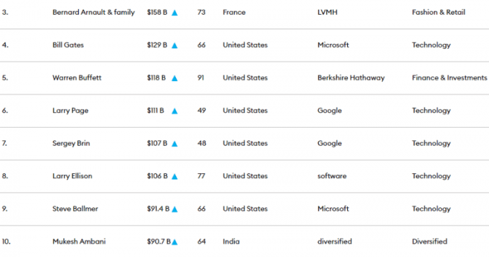 Zirvede 219 milyar dolarlık servetiyle Tesla’nın kurucusu Elon Musk yer aldı. Geçen yıl ilk sırada yer alan Amazon’un CEO’su Jeff Bezos 171 milyar dolarlık servetiyle ikinci sıraya geriledi