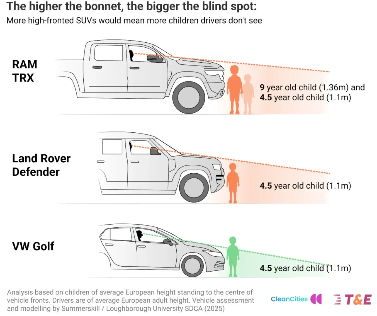 Avrupa’da şehirler üzerine çalışan T&E, yüksek kaputlu SUV ve kamyonetlerin yarattığı kör noktaları testlerle ortaya koydu. Bu testlerde, ortalama boydaki bir sürücü, yüksek kaputlu bir kamyonetin direksiyonundayken önünde duran 9 yaşındaki bir çocuğu göremedi. SUV kullanan bir sürücü ise 4,5 yaşına kadar olan çocukları görüş alanına alamıyor.