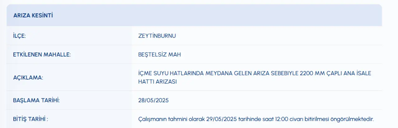 İSKİ'nin açıklamasına göre, Zeytinburnu'nun tamamında su kesintisi mevcut.