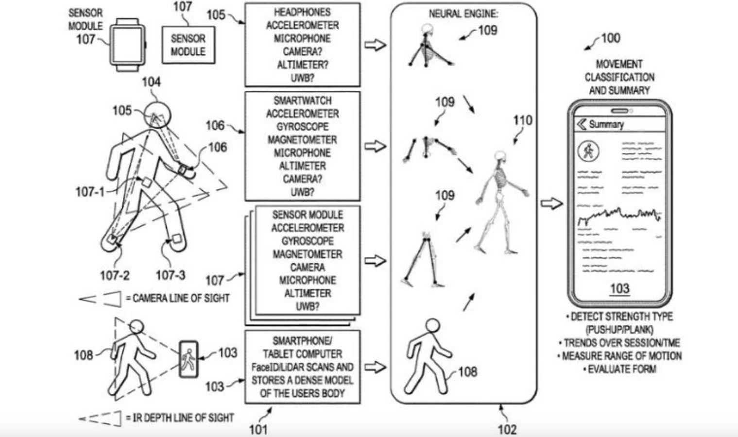 Apple'ın ikinci patentinde ise daha fazla gelişmişlik var. Bu bağlamda; Apple, bu patentte tüm vücudun 2 boyutlu iskelet modelini oluşturmaya odaklanıyor. Apple Watch veya AirPods gibi ürünlerdeki sensörleri kullanan marka, bu patent ile vücuttaki tüm hareketleri algılamaya odaklanıyor. Ayrıca patentte elde edilen verilerin fitness uygulamalarına aktarılmasından da bahsediyor. Bu önemli çünkü Apple, bu patent üzerine geliştireceği yazılımlarla tüm vücudun takibini yapabilen ultra gelişmiş fitness hizmeti sunmaya başlayabilir.