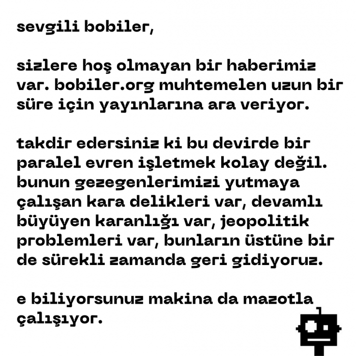 Sizlere hoş olmayan bir haberimiz var. Bobiler.org muhtemelen uzun bir süre için yayınlarına ara veriyor. Takdir edersiniz ki bu devirde bir paralel evren işletmek kolay değil. Bunun gezegenlerimizi yutmaya çalışan kara delikleri var, devamlı büyüyen karanlığı var, jeopolitik problemleri var, bunların üstüne bir de sürekli zamanda geri gidiyoruz. E biliyorsunuz makina da mazotla çalışıyor.