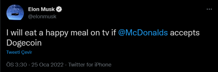 Elon Musk, McDonald's’ın Dogecoin kabul etmesi durumunda televizyonda happy meal menüsü (çocuk menüsü) yiyeceğini açıkladı.