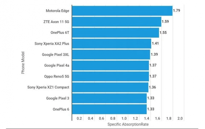 Listenin zirvesindeki Motorola Edge telefonu 1.79 SAR değeriyle en fazla radyasyon yayan akıllı telefon. Motorola Edge'i sırasıyla ZTE Axon 11 5G, OnePlus 6T, Sony Xperia XA2 Plus, Google Pixel 3XL, Google Pixel 4a, Oppoe Reno5 5G, Sony Xperia XZ1 Compact, Google Pixel 3 ve son olarak OnePlus 6 takip ediyor.