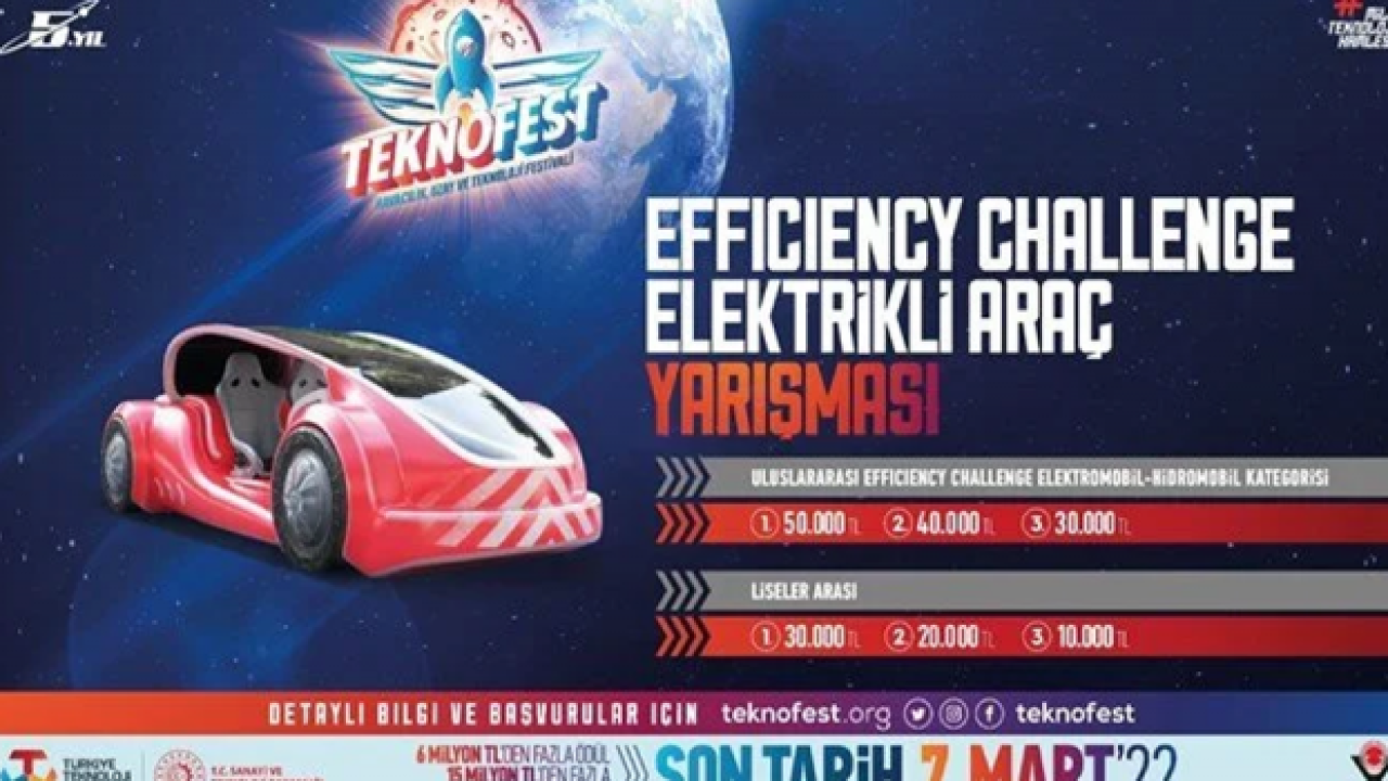 TEKNOFEST Havacılık, Uzay ve Teknoloji Festivali kapsamında TÜBİTAK tarafından düzenlenen Uluslararası Efficiency Challenge Elektrikli Araç Yarışları ile Liseler Arası Efficiency Challenge Elektrikli Araç Yarışları için başvurular devam ediyor.