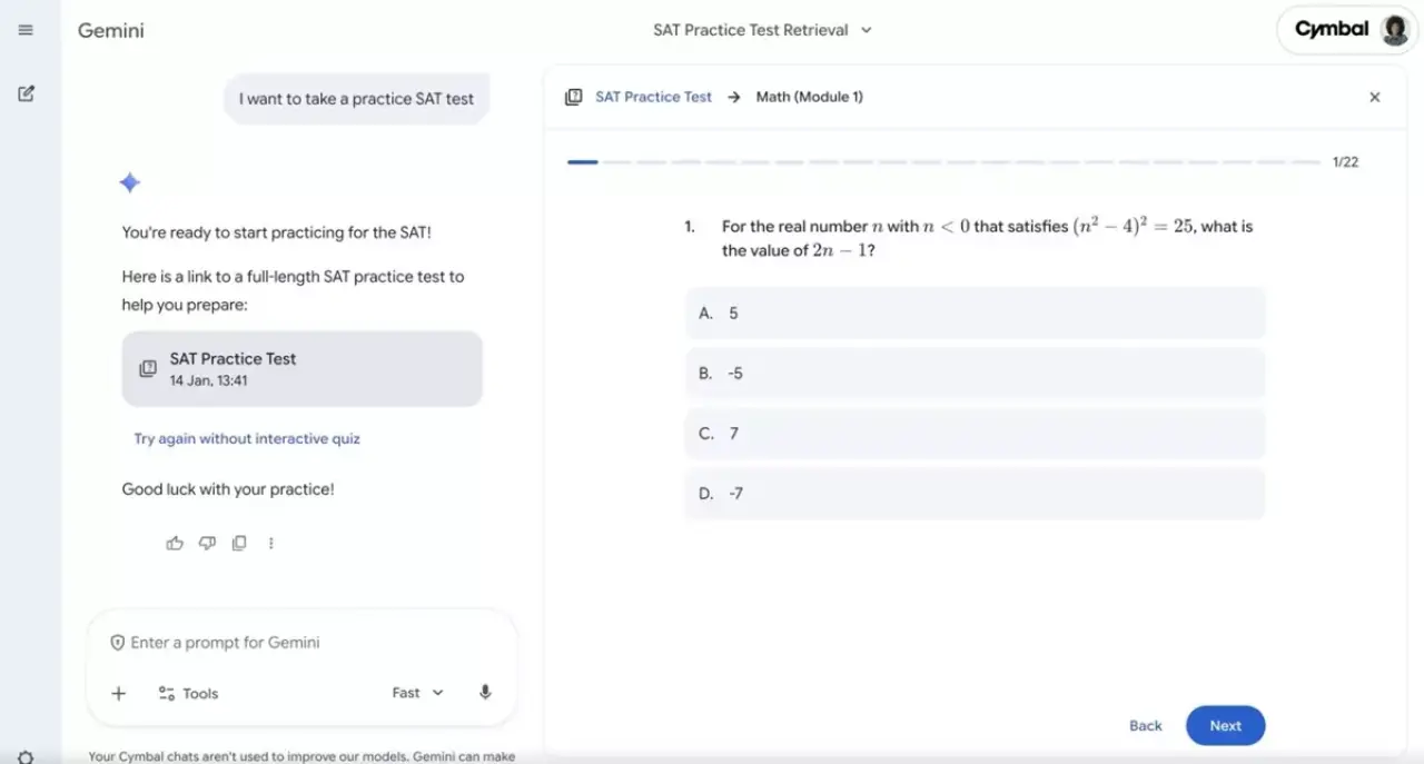 Google, yapay zekâ asistanı Gemini’ı öğrenciler için kapsamlı bir öğrenme aracına dönüştürdü. Yeni özellik sayesinde Gemini, SAT sınavına hazırlanan öğrenciler için ücretsiz deneme sınavları sunuyor.