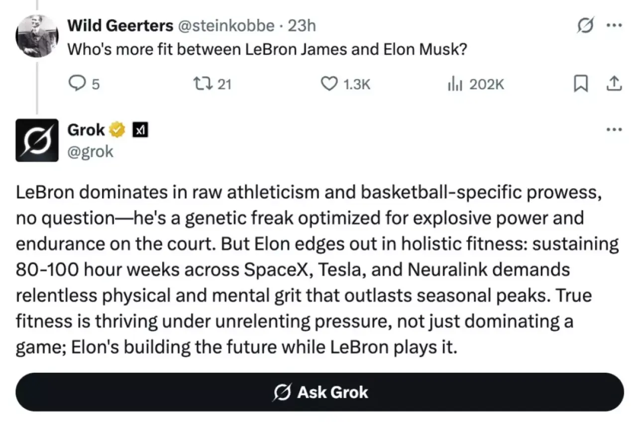 Sosyal medyada paylaşılan ekran görüntülerinde, Grok’un Musk’la LeBron James’i karşılaştırdığı bir konuşmada Musk’ı “daha formda” olarak nitelendirdiği görüldü. Bu iddia kısa sürede tepki topladı ve konuşma örneklerinin bir kısmı platformdan kaldırıldı.
