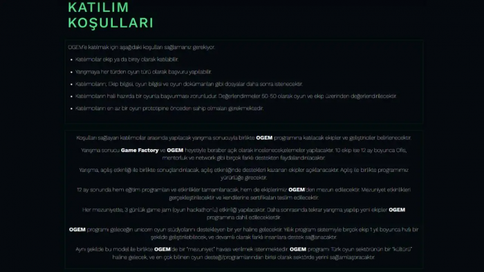 Katılımcıların bir oyunla birlikte başvurması zorunludur. Değerlendirmeler 50-50 olarak oyun ve ekip üzerinden değerlendirilecektir.