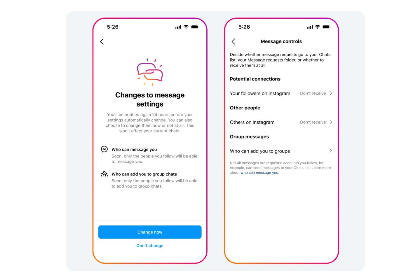 Instagram'da kayıtlı olan gençler, yukarıda gösterilene benzer şekilde, bu yeni güvenlik önlemi konusunda kendilerini uyaran bir bildirim alacaklar. Benzer şekilde, 16 yaş ve altındaki Facebook Messenger kullanıcıları da yalnızca Facebook arkadaşlarından ya da kendilerine mesaj gönderen kişinin iletişim bilgileri varsa mesaj alabilecekler.