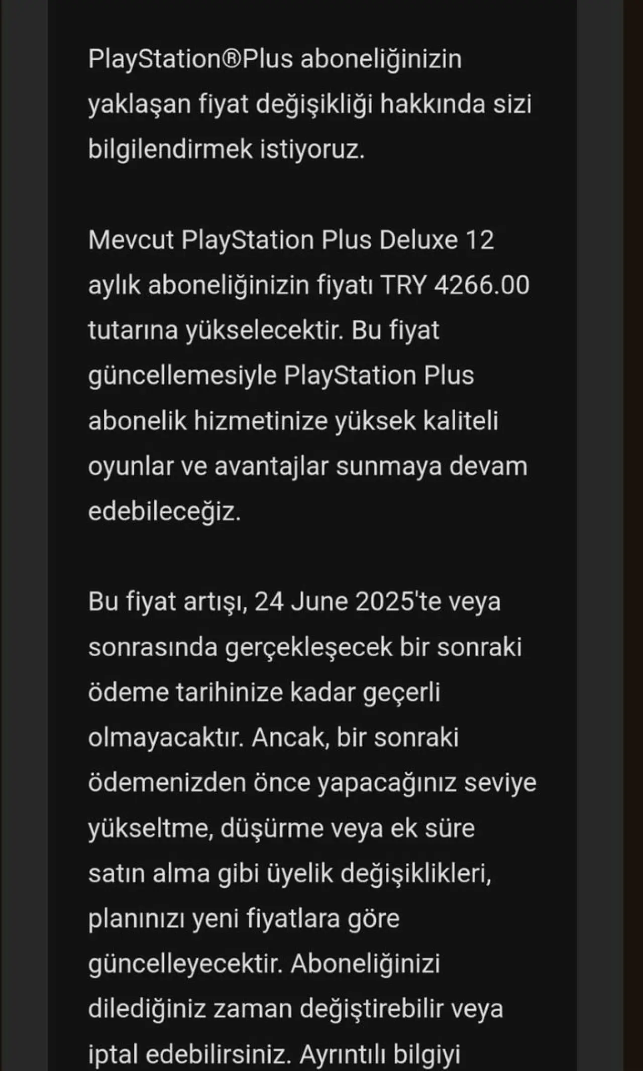 Sony, PlayStation Plus abonelik ücretlerine 2025’te yeni bir zam uyguladı. Kullanıcılara mail yoluyla bildirilen artış, 24 Haziran 2025’ten itibaren geçerli olacak. 2023’te küresel çapta %30-35 oranında artış yapılırken, Türkiye’de döviz kuru ve enflasyon nedeniyle bu oran %600’lere ulaşmıştı. Yeni zamla birlikte, özellikle Deluxe paketinde ciddi bir fiyat artışı dikkat çekiyor. Sony, bu artışın “yüksek kaliteli oyunlar ve ek avantajlar sunma” hedefiyle yapıldığını ifade ediyor. Ancak Türkiye’deki oyuncular, bu zamların bütçelerini zorlayacağından yakınıyor.