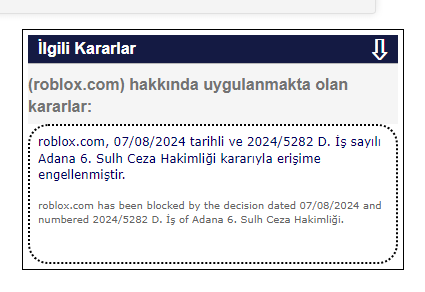 roblox.com, 07/08/2024 tarihli ve 2024/5282 D. İş sayılı Adana 6. Sulh Ceza Hakimliği kararıyla erişime engellenmiştir.