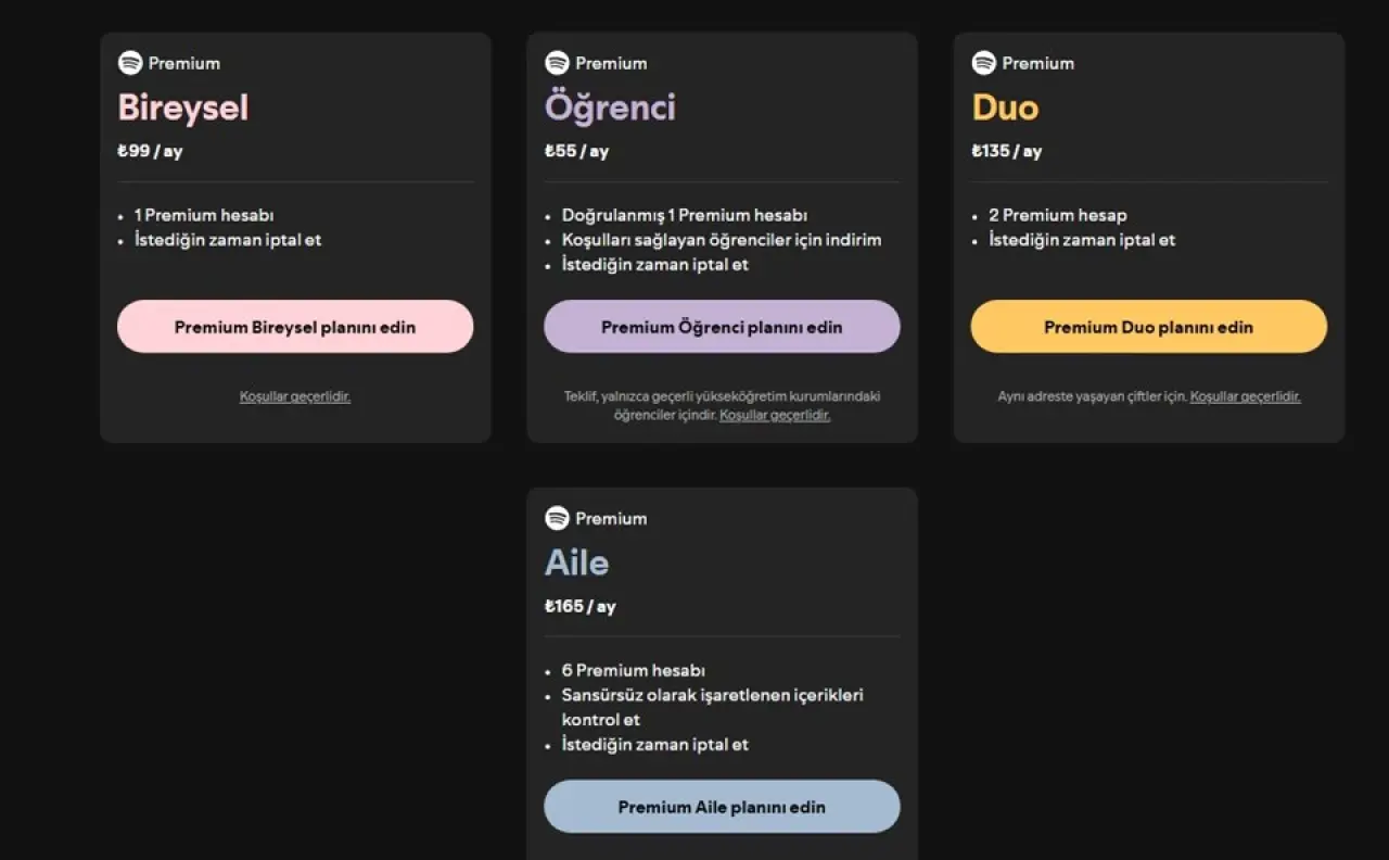 Spotify, son olarak Şubat 2024'te fiyatlarını artırmış ve Bireysel planı 59,99 TL, Duo planı 79,99 TL, Aile planını 99,99 TL ve Öğrenci planını 32,99 TL seviyesine çıkarmıştı. Yeni zamla birlikte, bireysel abonelik ücretinde neredeyse yüzde 65'lik bir artış yaşandı.