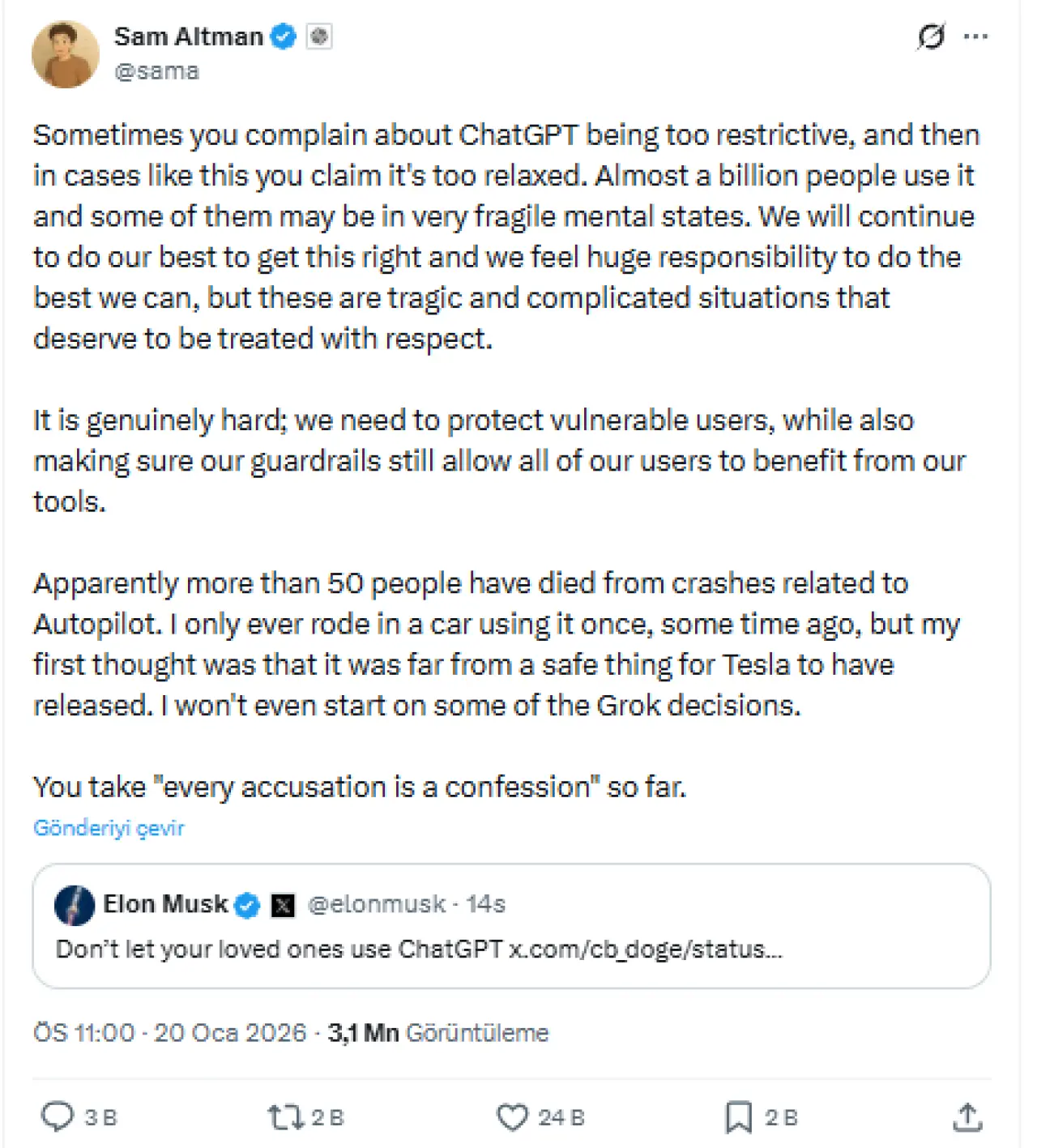 “Bazen ChatGPT’nin fazla kısıtlayıcı olduğundan şikâyet ediyorsun, sonra da bunun gibi durumlarda çok gevşek olduğunu iddia ediyorsun. Neredeyse bir milyar kişi ChatGPT kullanıyor ve bu insanların bir kısmı son derece kırılgan ruh hâllerinde olabilir. Biz bunu doğru yapabilmek için elimizden geleni yapmaya devam edeceğiz ve bu konuda büyük bir sorumluluk hissediyoruz; ancak bunlar saygıyla ele alınmayı hak eden trajik ve karmaşık durumlar.