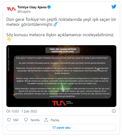 Yeşil ışık saçan meteorun görüntülendiği ifade edilen açıklamada, "Bu gök cisimleri kimyasal yapıları sebebiyle atmosferde pek çok farklı renkte gözlemlenebilir. Meteorlar, Dünya atmosferine girdiklerinde çok sayıda hava molekülü ile çarpışırlar. Bu çarpışmalar parçacığın dış katmanlarını püskürterek sodyum, demir ve magnezyum atomlarından oluşan bir buhar oluşturur.